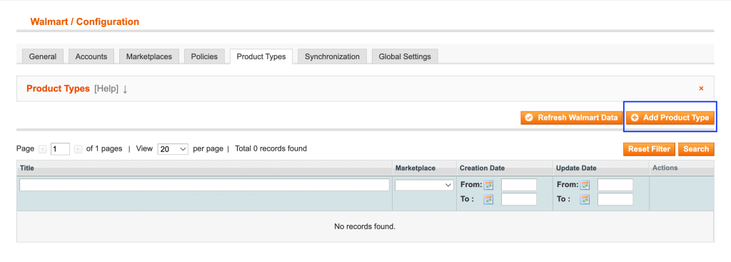 To set up a Product Type for your listings, navigate to Walmart > Configuration > Product Types.