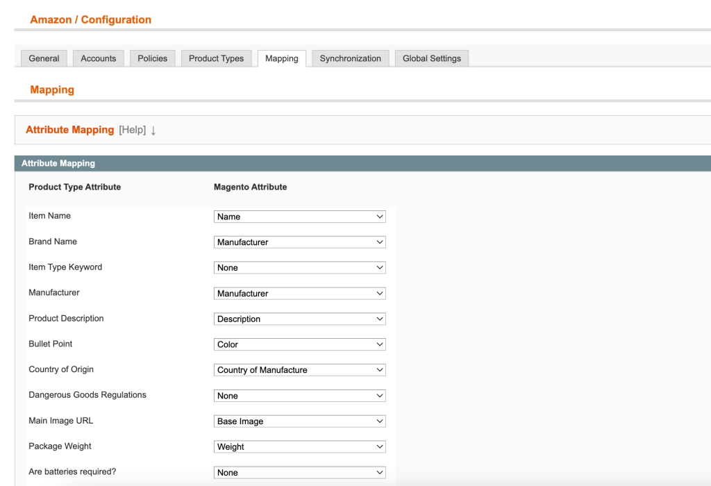 Attribute mapping guarantees that the correct attributes are consistently associated with each Product Type specific. You can edit the saved mapping if a different Magento attribute value is more appropriate for a certain Amazon Product Type specific.