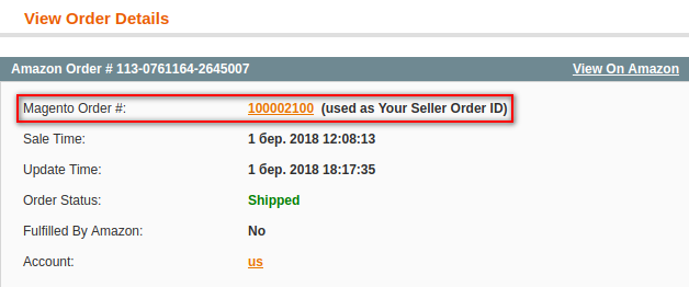 - Use as Your Seller Order ID - allows attaching your Magento Order number to Amazon Order details. After Magento Order is created, its number will be submitted to the Channel Order as Your Seller Order ID.